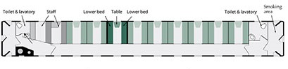 4-berth compartments have two upper and two lower berths, and luggage-stowage below the lower berths, and in the large overhead bays. There are reading lights and a table.